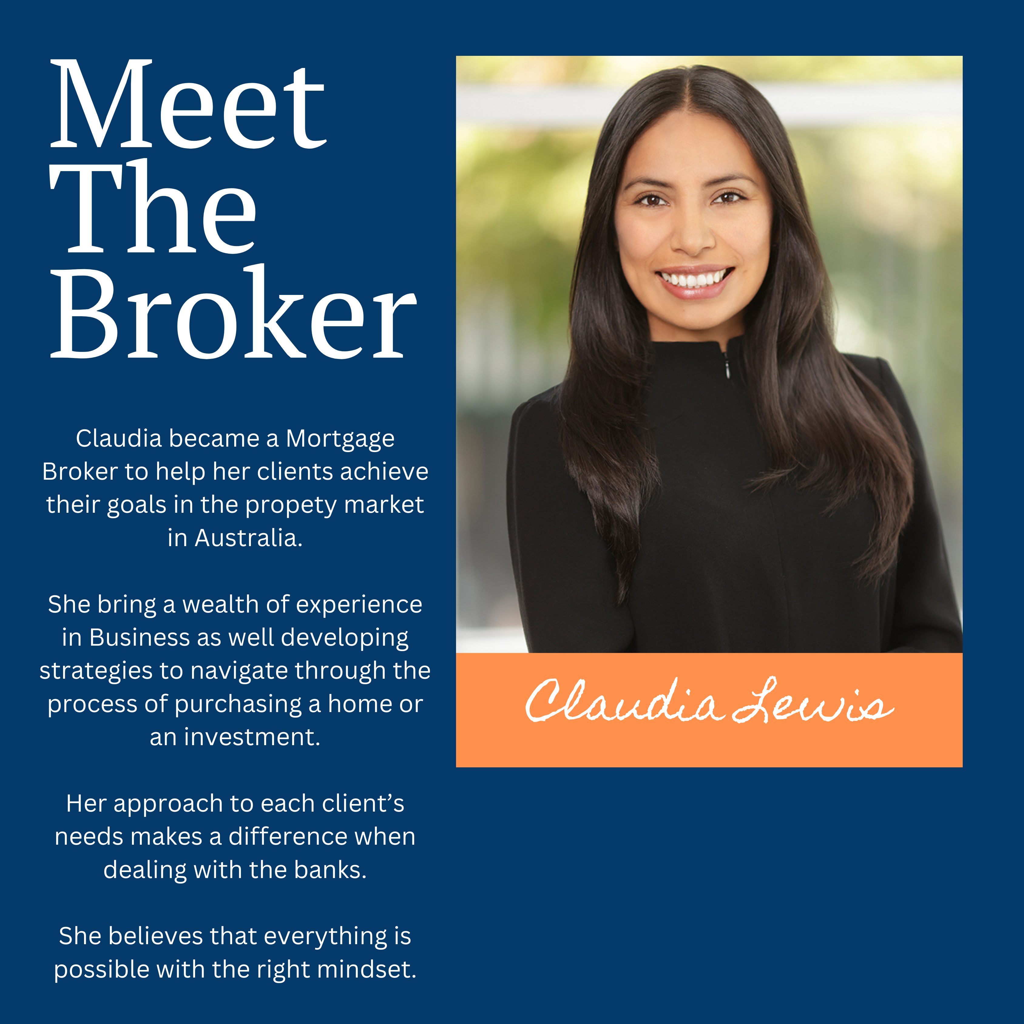 Get in contact today and speak with Mortgage Broker Claudia Lewis using the details on this page and lets chat about how we can help you achieve your financial goals sooner than you think.